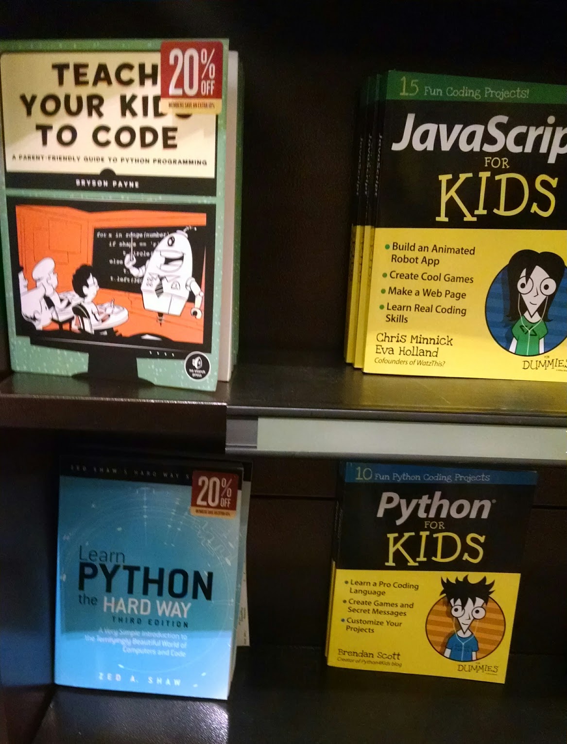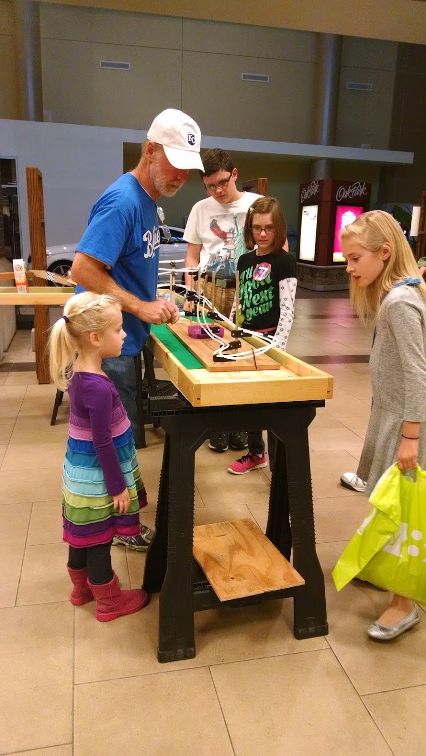 Most of the curious onlookers were younger than 15, and more than half of them were girls. Two local FIRST Robotics teams were present, demonstrating two classes of competition. A local maker was showing kids how to use plastic "refrigerator tubing" water line and thick wire to build inexpensive marble roller-coasters, and a store employee was demonstrating several products to an excited audience of youngsters and curious adults alike. A 3D printer, programmable robots and Minecraft came up as interesting gateways to the joys of making things. Programming books geared for children were openly on display.