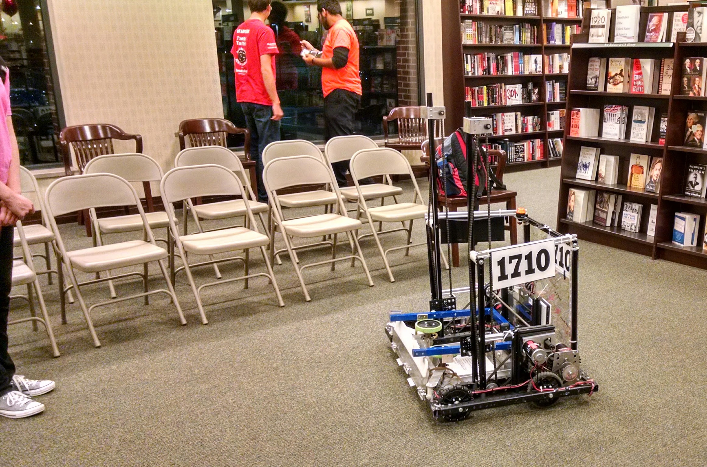 Most of the curious onlookers were younger than 15, and more than half of them were girls. Two local FIRST Robotics teams were present, demonstrating two classes of competition. A local maker was showing kids how to use plastic "refrigerator tubing" water line and thick wire to build inexpensive marble roller-coasters, and a store employee was demonstrating several products to an excited audience of youngsters and curious adults alike. A 3D printer, programmable robots and Minecraft came up as interesting gateways to the joys of making things. Programming books geared for children were openly on display.
